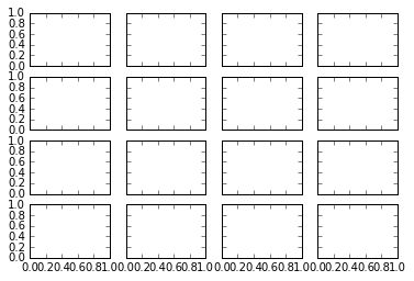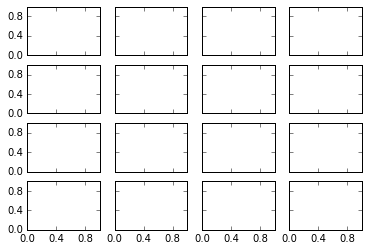 fig, ax = plt.subplots(4 , 4 , sharex=True , sharey=True )