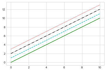 plt.plot(x, x + 0 , '-g' ) # 绿色实线 plt.plot(x, x + 1 , '--c' ) # 天青色虚线 plt.plot(x, x + 2 , '-.k' ) # 黑色长短点虚线 plt.plot(x, x + 3 , ':r' ); # 红色点线