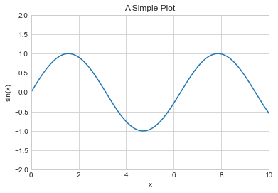 ax = plt.axes() ax.plot(x, np.sin(x)) ax.set(xlim=(0 , 10 ), ylim=(-2 , 2 ), xlabel='x' , ylabel='sin(x)' , title='A Simple Plot' );