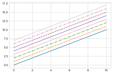 plt.plot(x, x + 0 , linestyle='solid' ) plt.plot(x, x + 1 , linestyle='dashed' ) plt.plot(x, x + 2 , linestyle='dashdot' ) plt.plot(x, x + 3 , linestyle='dotted' );# 还可以用形象的符号代表线条风格 plt.plot(x, x + 4 , linestyle='-' ) # 实线 plt.plot(x, x + 5 , linestyle='--' ) # 虚线 plt.plot(x, x + 6 , linestyle='-.' ) # 长短点虚线 plt.plot(x, x + 7 , linestyle=':' ); # 点线