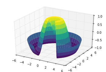 theta = 2 * np.pi * np.random.random(1000 ) r = 6 * np.random.random(1000 ) x = np.ravel(r * np.sin(theta)) y = np.ravel(r * np.cos(theta)) z = f(x, y)