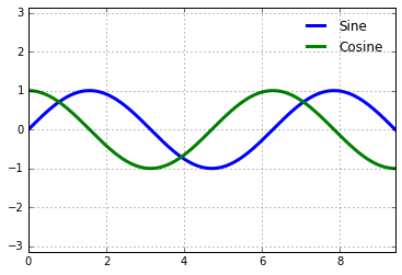 # 绘制正弦和余弦图表 fig, ax = plt.subplots() x = np.linspace(0 , 3 * np.pi, 1000 ) ax.plot(x, np.sin(x), lw=3 , label='Sine' ) ax.plot(x, np.cos(x), lw=3 , label='Cosine' )# 设置网格、图例和轴极限 ax.grid(True ) ax.legend(frameon=False ) ax.axis('equal' ) ax.set_xlim(0 , 3 * np.pi);