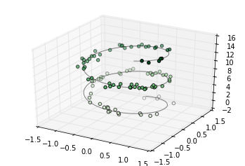 ax = plt.axes(projection='3d' )# 三维螺旋线的数据 zline = np.linspace(0 , 15 , 1000 ) xline = np.sin(zline) yline = np.cos(zline) ax.plot3D(xline, yline, zline, 'gray' )# 三维散点的数据 zdata = 15 * np.random.random(100 ) xdata = np.sin(zdata) + 0.1 * np.random.randn(100 ) ydata = np.cos(zdata) + 0.1 * np.random.randn(100 ) ax.scatter3D(xdata, ydata, zdata, c=zdata, cmap='Greens' );