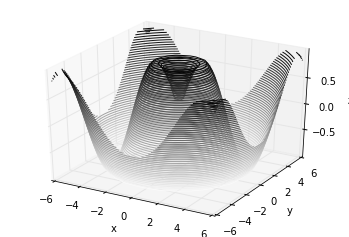 fig = plt.figure() ax = plt.axes(projection='3d' ) ax.contour3D(X, Y, Z, 50 , cmap='binary' ) ax.set_xlabel('x' ) ax.set_ylabel('y' ) ax.set_zlabel('z' );