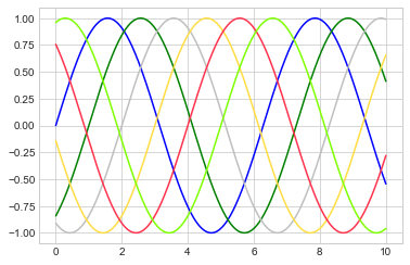 plt.plot(x, np.sin(x - 0 ), color='blue' ) # 通过颜色名称指定 plt.plot(x, np.sin(x - 1 ), color='g' ) # 通过颜色简写名称指定(rgbcmyk) plt.plot(x, np.sin(x - 2 ), color='0.75' ) # 介于0-1之间的灰阶值 plt.plot(x, np.sin(x - 3 ), color='#FFDD44' ) # 16进制的RRGGBB值 plt.plot(x, np.sin(x - 4 ), color=(1.0 ,0.2 ,0.3 )) # RGB元组的颜色值,每个值介于0-1 plt.plot(x, np.sin(x - 5 ), color='chartreuse' ); # 能支持所有HTML颜色名称值