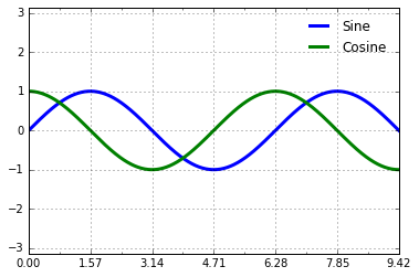 复杂的刻度格式 Matplotlib 的默认刻度格式只能在很多常见情况下工作良好,但是在特殊情况下你会希望能够更多的进行个性化。考虑下面的正弦和余弦图表: