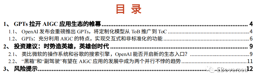 AI生态入口不光为大模型和平台的提供商创造了极大的商业价值,同样赋能了AIGC上下游产业链。GPTs拉开了AIGC应用生态的帷幕,通过将定制化AIGC功能推广到广大ToC用户,促进AIGC应用产品的创新,而具备强大软件研发能力的科技公司则可以吸收这些创作者的想法,开发出功能更完善、商业路径更清晰的AIGC应用,在算力成本进一步降低、大模型性能进一步提升后,有望快速推出AIGC应用并启动飞轮效应。建议关注: