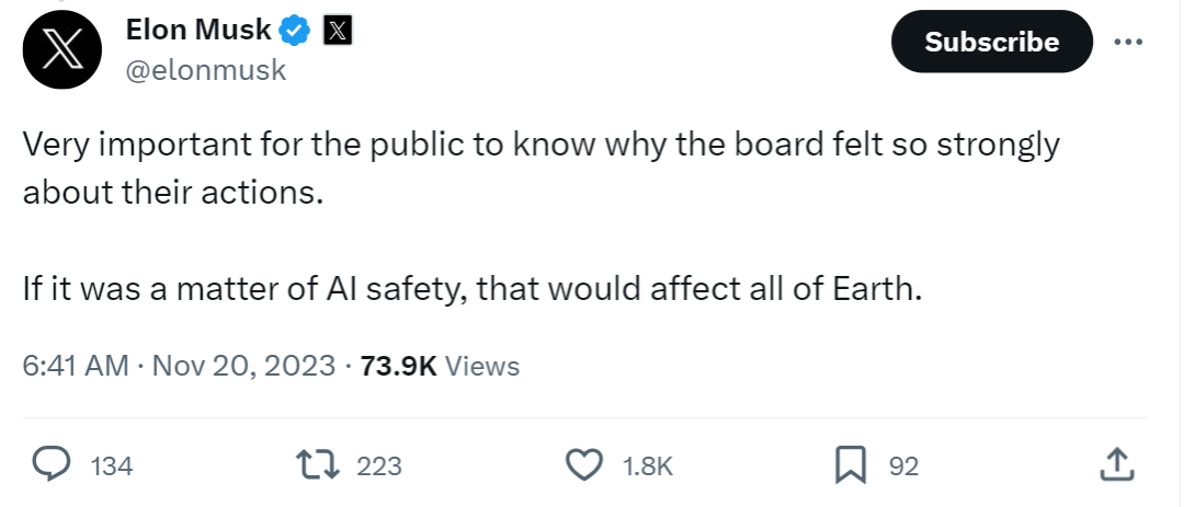 19日下午,在网友质疑人们过于一致地支持奥特曼的推文下,曾与奥特曼等人一同创办OpenAI的埃隆·马斯克(Elon Musk)回复道:“非常重要的是,公众应该知道为何董事会如此坚决地做出决定。如果这关乎AI安全,那将会影响整个地球。”