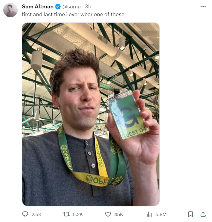 当地时间11月19日中午,奥特曼在X(原推特)平台上晒出一张自己手持OpenAI访客卡的照片,并在配文中写道:“我第一次也是最后一次戴这种东西。”