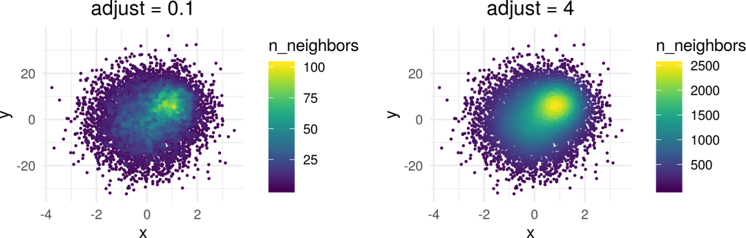 install.packages("ggpointdensity" )# Alternatively, you can install the latest # development version from GitHub: if (!requireNamespace("devtools" , quietly = TRUE)) install.packages("devtools" ) devtools::install_github("LKremer/ggpointdensity" ) library(ggplot2) library(dplyr) library(viridis) library(ggpointdensity) dat tibble(x = rnorm(7000, sd = 1), y = rnorm(7000, sd = 10), group = "foo" ), tibble(x = rnorm(3000, mean = 1, sd = .5), y = rnorm(3000, mean = 7, sd = 5), group = "bar" )) ggplot(data = dat, mapping = aes(x = x, y = y)) + geom_pointdensity() + scale_color_viridis()geom_pointdensity()案例01 还可以通过修改geom_pointdensity()函数中的adjust参数,实现不同样式的散点密度图效果: