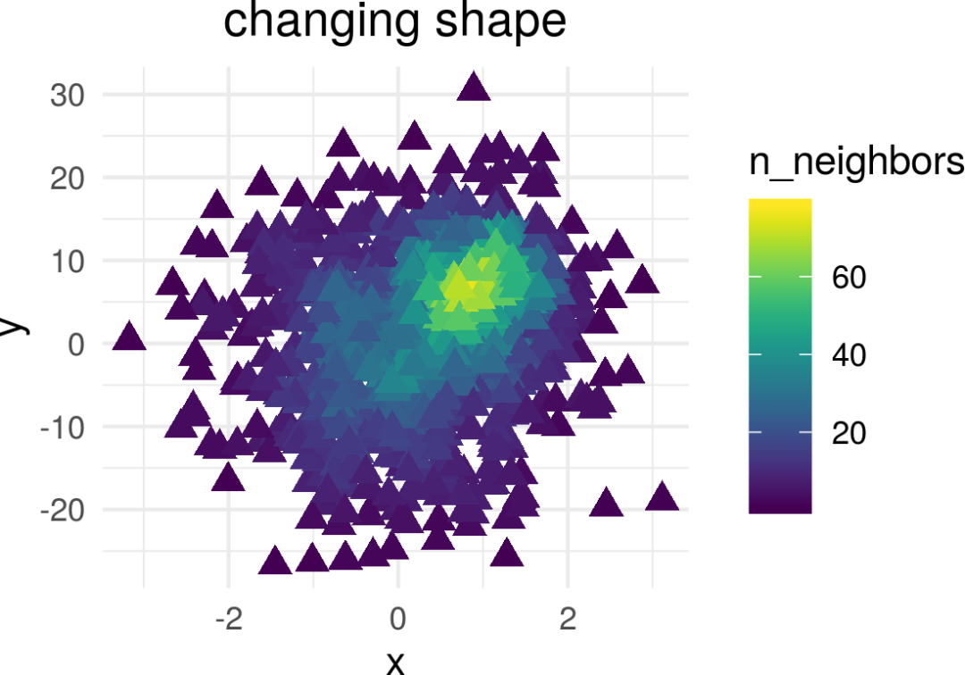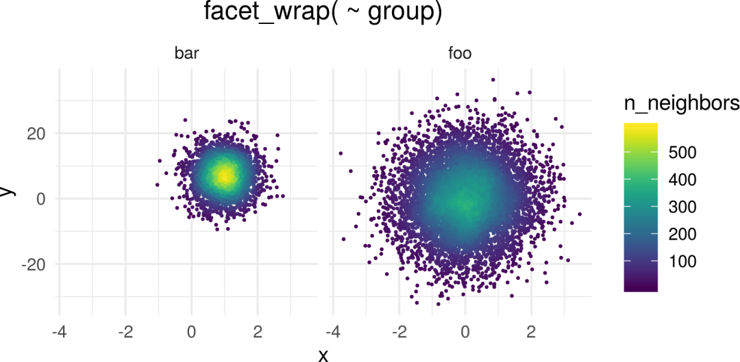 ggplot(data = dat, mapping = aes(x = x, y = y)) + geom_pointdensity(adjust = .1) + scale_color_viridis() ggplot(data = dat, mapping = aes(x = x, y = y)) + geom_pointdensity(adjust = 4) + scale_color_viridis()设置adjust参数效果 当然,分面绘图和修改散点的形状等操作,都是可以完成的,可视化效果如下: