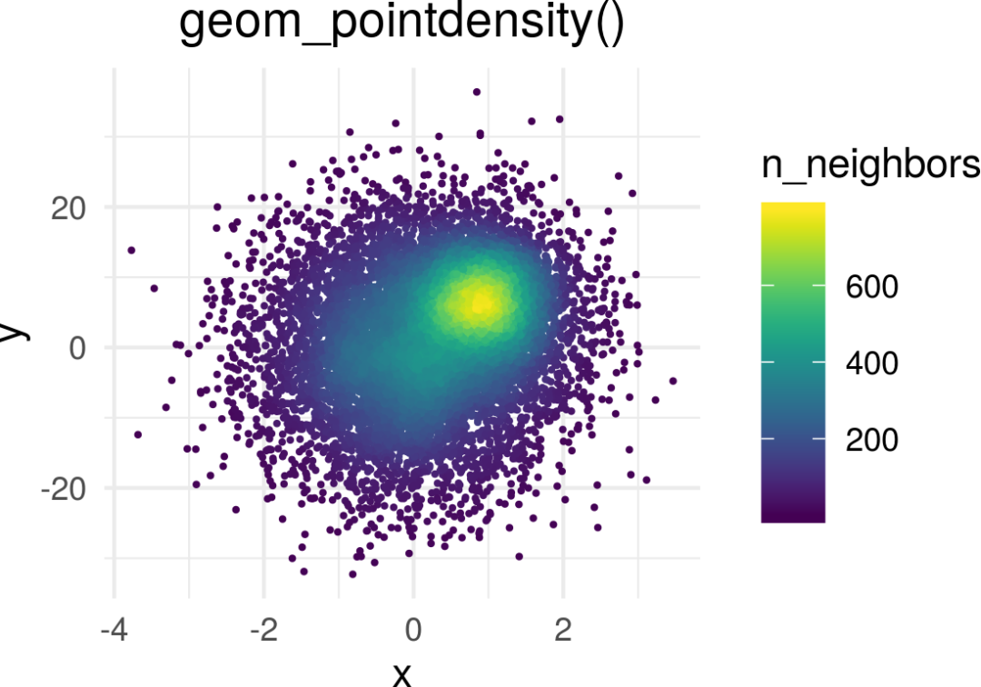 使用ggpointdensity包,你可以轻松地创建具有以下特点的点密度图: