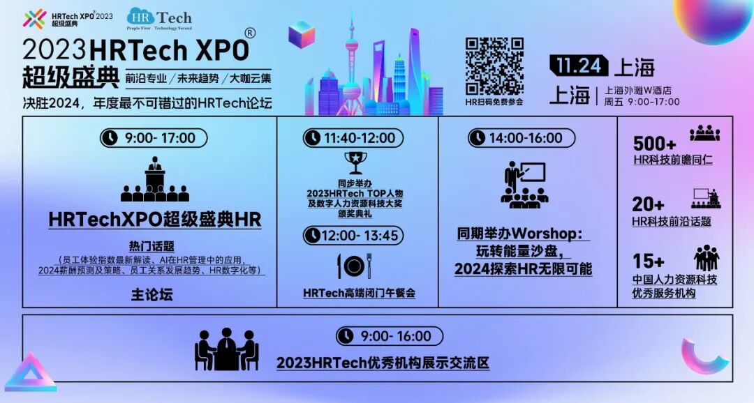 报名:http://hrnext.cn/jK5t24 报名超过500+,部分来自宜家、菲斯科软件、特斯拉、美团、纳宝蒂、联通上海、宝茂投资、易鑫集团、优米汽车、诺华制药、傲胜中国、光明食品、豪利士、宝洁、富民银行、住总集团、罗姆化学、翠丰集团、施耐德电气、药明康德、海康威视、同济建设、卫龙、道达尔、赫比、乐众信息、阿维塔新能源、申能集团、同程旅行、太安堂药业、金光纸业、万向、闪送、浩鲸云、上海电气、浦发硅谷银行、海尔集团、兴业证券、三花控股、HSBC、英格尔检测、泰康保险集团、素然服饰、风涌云动、GE、商汤、马克华菲、圣象家居、塔塔信息、上海证券、吉利、GSK、国泰产险等等HR科技同仁