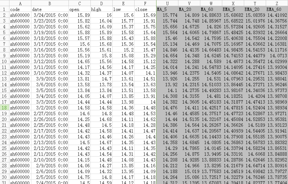 2.计算各类移动平均线,包括简单简单算术移动平均线MA、指数平滑移动平均线EMA;
