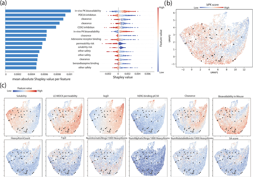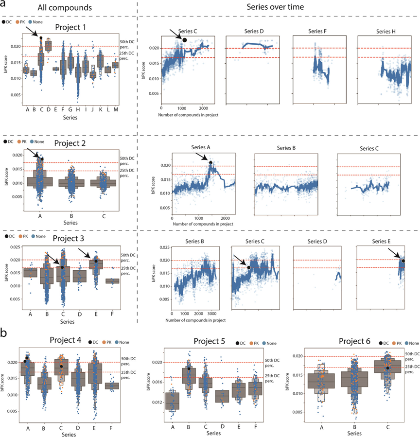 0.79),而仅使用ADMET数据时,ROC-AUC 显著降低(0.74),说明体外ADMET数据是模型的主要信息来源。作者还使用主成分分析得到的前2、5、10和20个特征来训练bPK打分模型。令人惊奇的是,在仅使用10个特征的情况下,模型AUC达到0.79。细微的特征变化并未使模型预测结果产生较大的波动,并且没有出现严重的过拟合现象,表明该模型具有较强的鲁棒性。为了深入了解不同ADMET预测方法对bPK打分模型的影响,作者使用可解释性AI模型量化特征重要性(图2)。在Shapley值最高的15个特征中,包含了体内生物利用度、清除率、渗透性和溶解度等相关测定。这些特征与候选分子挑选规则基本一致。在UMAP降维图中,候选药物一致分布在bPK分数较高的区域,但从结构以及性质角度来看并未得到可总结性的规律。为了评估模型的泛化能力,作者从ChEMBL数据构建了一个公共数据集,来模拟內部数据集的分布。ROC曲线结果显示bPK打分模型在公共数据集上具有与内部数据几乎一致的表现。这些结果表明该模型具有较好的泛化能力和鲁棒性。图2:(a)bPK打分模型输入特征Shapley分析结果(b)以bPK分数着色的UMAP降维图(c)根据性质及结构特征着色的UMAP降维图最后,作者利用bPK打分模型在诺华公司的内部项目上进行了回顾性研究。他们导出了几个项目中经过诺华化学团队详细注释及表征的所有分子,然后使用bPK评分对化合物进行评分。作者分析了不同项目中bPK分数随时间演变规律(图3)。除了项目2之外,其他项目中使用的不同化合物系列均展现出不同的分布规律,且bPK分数随化合物优化推进而增加,每个项目所选定的候选药物均获得最高的bPK打分。该结果表明,bPK打分模型可以从已有化合物中获取经验,并将该经验用于指导苗头化合物的发现、先导化合物骨架优化及分子生成过程。综上所述,作者提出了一种新颖的机器学习模型-bPK打分模型,该模型利用大规模体外ADMET预测结果作为输入。相比于其他单一条件作为输入的计算方法,这种集成式输入使模型在庞大的化合物性质空间实现最大范围的探索。在多个数据集中,bPK打分模型均表现出强大的鲁棒性以及泛化能力。应用bPK打分可以有效区分不同系列化合物并最终确定其优先级,对于药物发现及优化具有重要意义。[1] Beckers M, Sturm N, Sirockin F, Fechner N, Stiefl