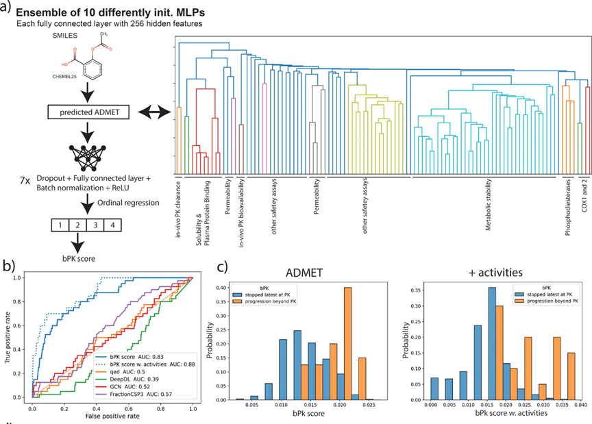 Developability Using Large-Scale In Silico ADMET Models”为题发表在美国化学会出版的药物化学核心期刊Journal of Medicinal Chemistry上(DOI:10.1021/acs.jmedchem.3c01083)。在该项研究中,作者对药物研发过程中的不同时间节点进行分类,将2005年至2017年间记录的近40000个化合物的理化特征数据及生物学数据用于训练深度神经网络模型。该模型采取秩次一致有序回归(rank-consistent ordinal regression)架构,以公司内部使用的ADMET模型及MELLODDY模型产生约100个的描述符作为模型的输入,根据预测产生的化合物ADMET图谱推断化合物在体内药代动力学(PK)阶段以外的研究潜力。为了评估bPK打分模型的性能,作者首先构建了一个包含约10000个化合物的内部测试集并进行打分,以分析该模型区分候选药能力,并与其他计算方法进行了比较。结果显示(图1b),QED、DeepDL或GCN等方法在内部测试集上没有显示出任何显著的辨别力,而作为基线模型的Fsp3模型的ROC-AUC为0.57,相较之下,bPK打分模型的ROC-AUC为0.83,展现出该模型较强的判别能力。图1:(a)bPK打分模型架构(左)和用于预测单个化合物的模型概述(右);(b)bPK打分模型与和其他已发表的化合物评分(QED、