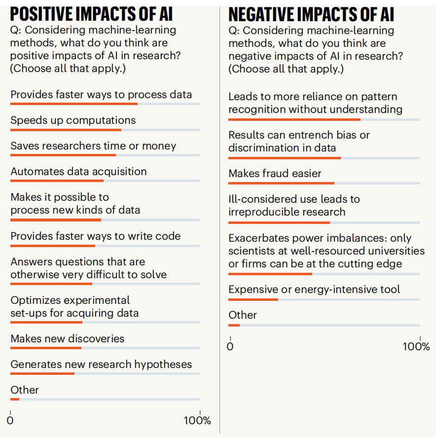图. AI对科研的影响(左:积极影响;右:负面影响)