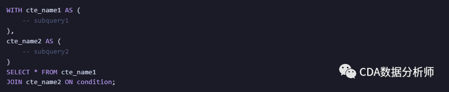 在这里,cte_name是公共表表达式的名称,你可以在后续的查询中使用它。subquery是定义CTE的查询,它可以是任何有效的SELECT查询。你可以在一个查询中定义多个CTEs,只需用逗号分隔即可:3.WITH 的使用示例