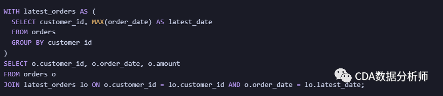 假设我们有一个名为orders的表,我们想要获取每个客户的最新订单。这个问题可以通过使用WITH子句来解决,如下所示:在这个例子中,我们首先在WITH子句中定义了一个名为latest_orders的CTE,它获取每个客户的最新订单日期。然后,在主查询中,我们通过连接orders表和这个CTE,来获取每个客户的最新订单的详细信息。4.总结