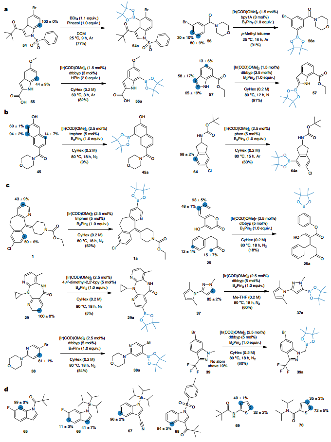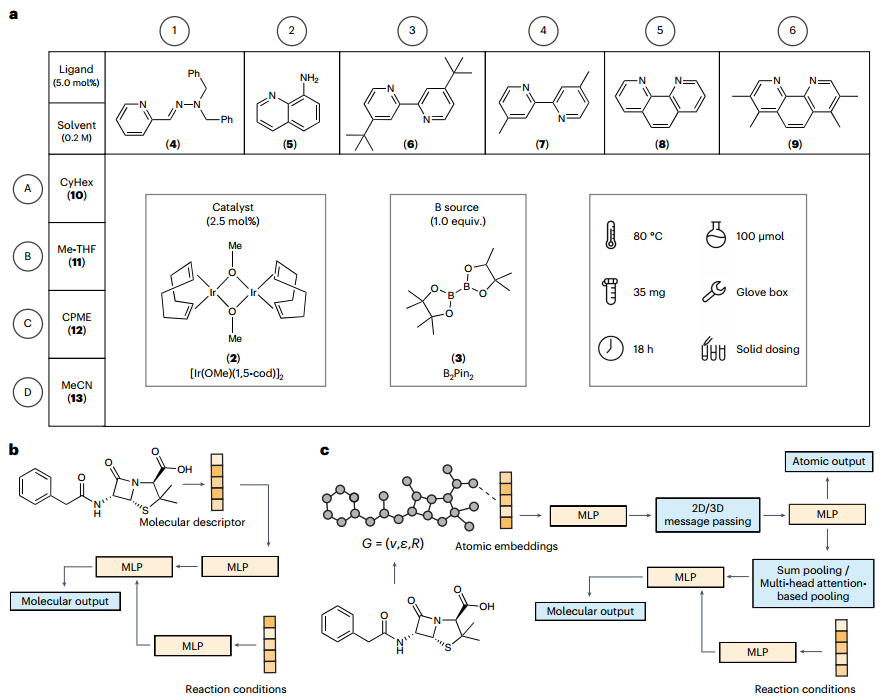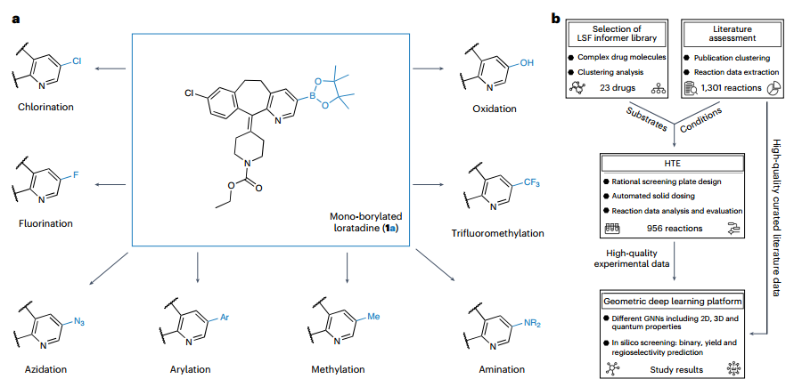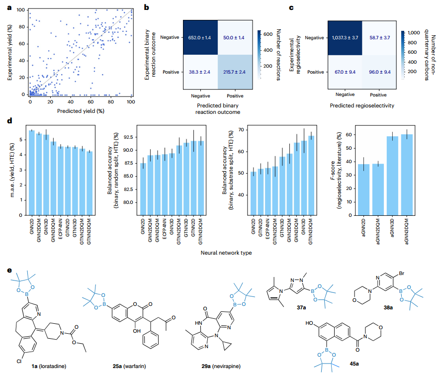 结构的新颖性和复杂性使得在药物化学中建立结构-活性关系时,合成化学目标结构具有挑战性。结构-活性关系模型指导着“从候选物到先导化合物”(hit-to-lead)和“先导化合物优化”(lead optimization)路径,旨在提高候选药物的药理活性和理化性质。对于结构-活性关系探索而言,高效的合成非常重要,因为合成是设计-制造-测试-分析循环中的一个瓶颈。虽然,后期功能化可以优化候选药物特性,但是,由于药物分子的化学复杂性,后期多样化往往具有挑战性。为了解决这个问题,本研究开发了一个基于几何深度学习和高通量反应筛选的后期功能化平台。考虑到硼酰化是后期功能化的关键步骤,计算模型预测了不同反应条件下的反应产率,平均绝对误差范围为 4-5%,而对已知和未知底物的新型反应进行分类的平衡准确率分别为 92% 和 67%。主要产物的区域选择性被准确捕捉,分类的 F 分数为 67%。当应用于 23 种不同的商业药物分子时,该平台成功地发现了许多结构多样化的机会。该平台还量化了几何和电子信息对模型性能的影响,并介绍了一种全面、简单、用户友好的反应格式(reaction format),该格式被证明是将深度学习和高通量实验无缝集成到后期官能化的关键推动因素。