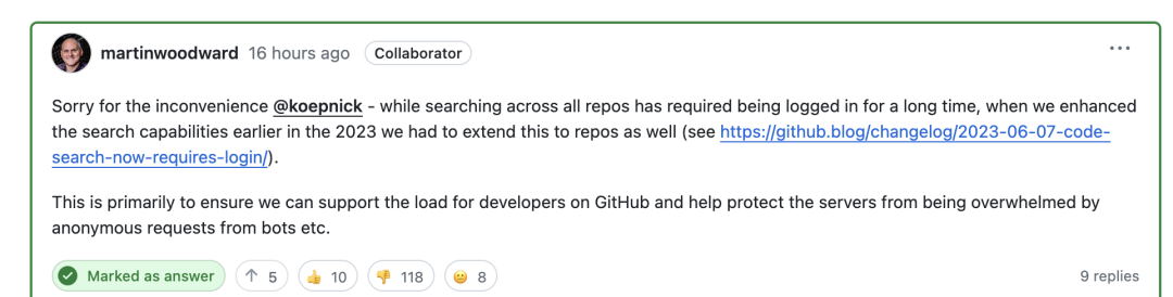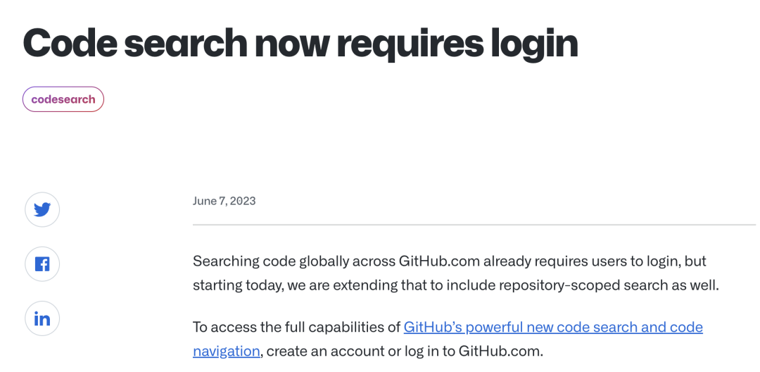 事实上,在今年 6 月,GitHub 官方便发布了一封《代码搜索现在需要登录》的公告内容,官宣除了在 GitHub.com 上全局搜索代码已经需要用户登录的政策之后,自 6 月 7 日起,这一政策将其扩展为包括存储库范围的搜索。