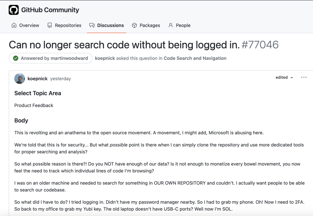 另一方面,现有用户会对 GitHub 感到恼火,因为他们甚至无法在不登录的情况下进行搜索,有时这很痛苦(不是他们的电脑,公共电脑,隐身标签,执行 2fa 所需的时间)。