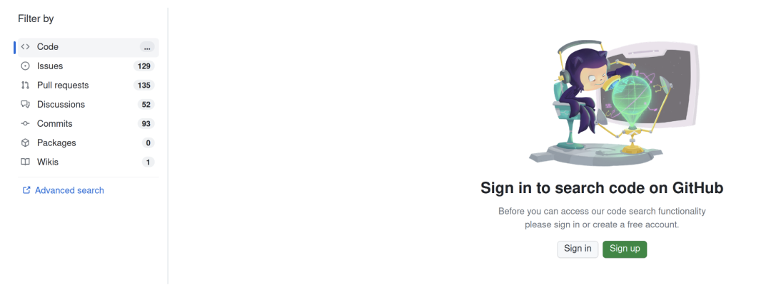 即,要访问 GitHub 的新代码搜索和代码导航的全部功能,需要创建账户或登录 GitHub.com。