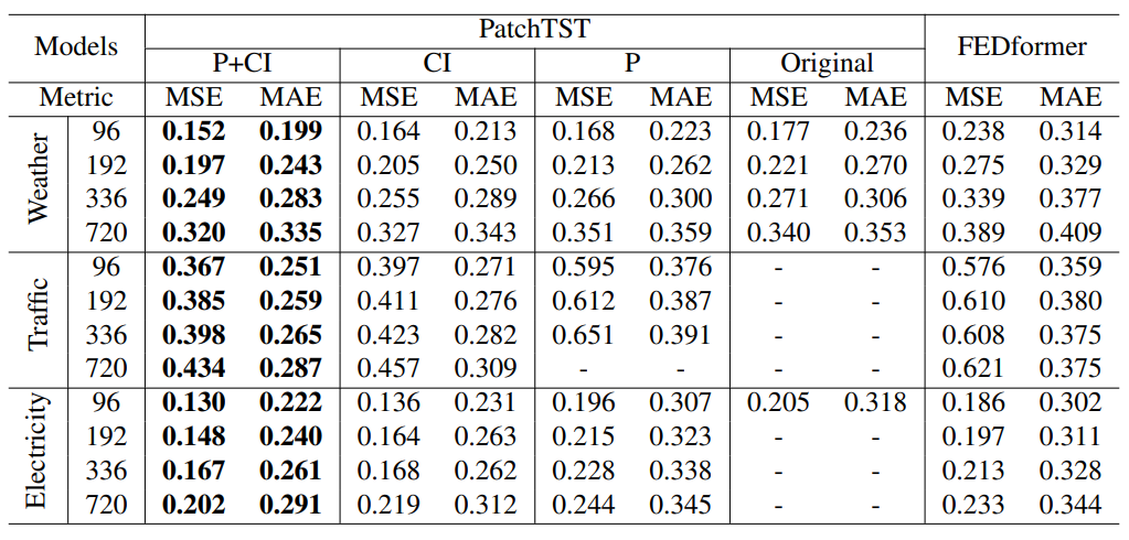 实验结果表明:patching和Channel-independence都是提高预测性能的重要因素。