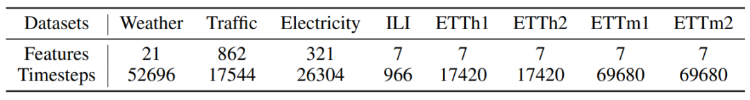 天气、交通、电力、ILI和4个ETT数据集(ETTh1、ETTh2、ETTm1、ETTm2)