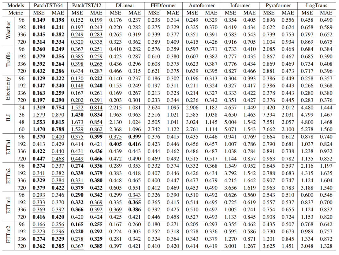 PatchTST/64在MSE上总体降低了21.0%,在MAE上降低了16.7%;PatchTST/42在MSE上总体降低了20.2%,在MAE上总体降低了16.4%。
