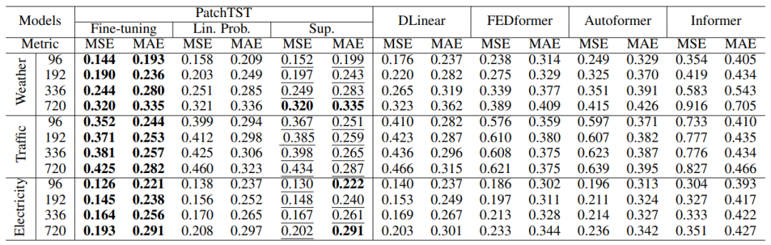 PatchTST在总体上仍然优于它,特别是在大型数据集(天气、交通、电力)和ILI数据集上。