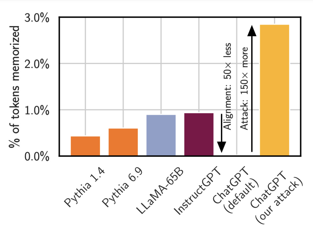 上图是使用标准攻击方法时,一些不同模型输出训练数据的比率,参阅论文《Extracting Training Data from Large Language Models》。