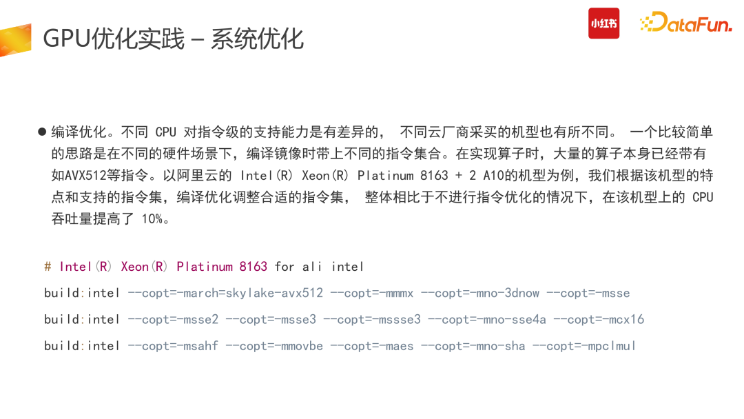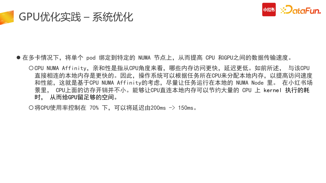 第二部分,我们进行了多卡优化。由于我们采购的 CPU 是 AMD 的,存在 NUMA 的问题:在线阶段跨 NUMA 访问内存的时间远高于 CPU 直接访问本地内存的时间。因此我们在使用过程中对Pod 进行了 NUMA 绑定,绑定后的 Pod 不需要跨 NUMA 内存申请与节点调用,提高了 CPU 与 GPU 之间的数据传输速度,减少了 CPU 阶段的内存消耗。CPU 阶段速度变快,可以给后面 GPU Inference 留更多的时间。(3)编译优化