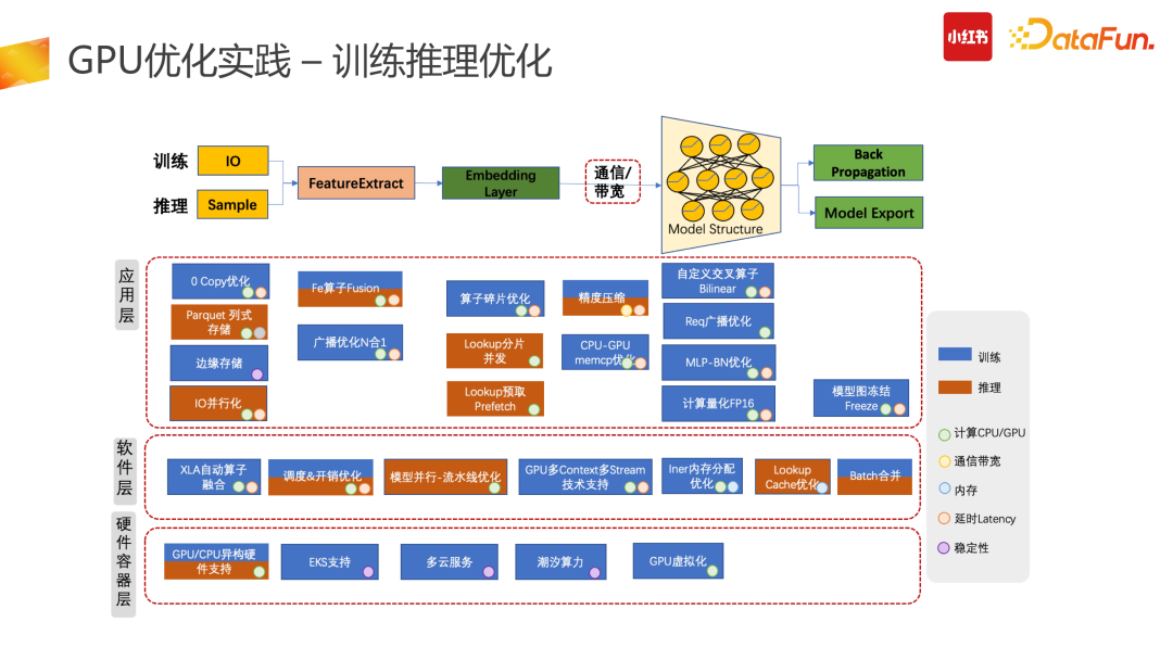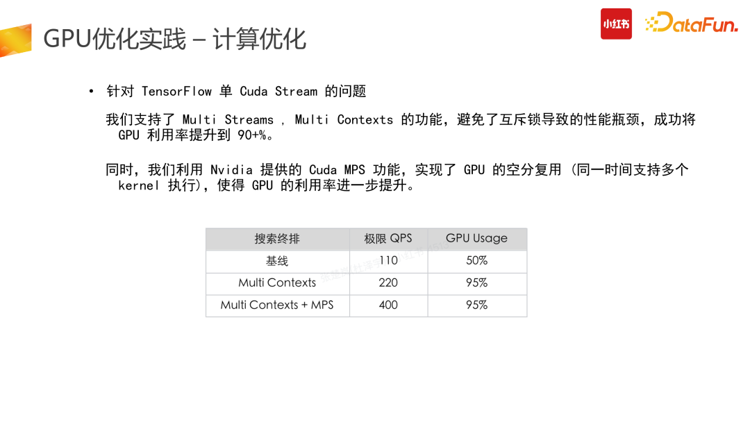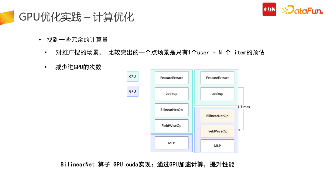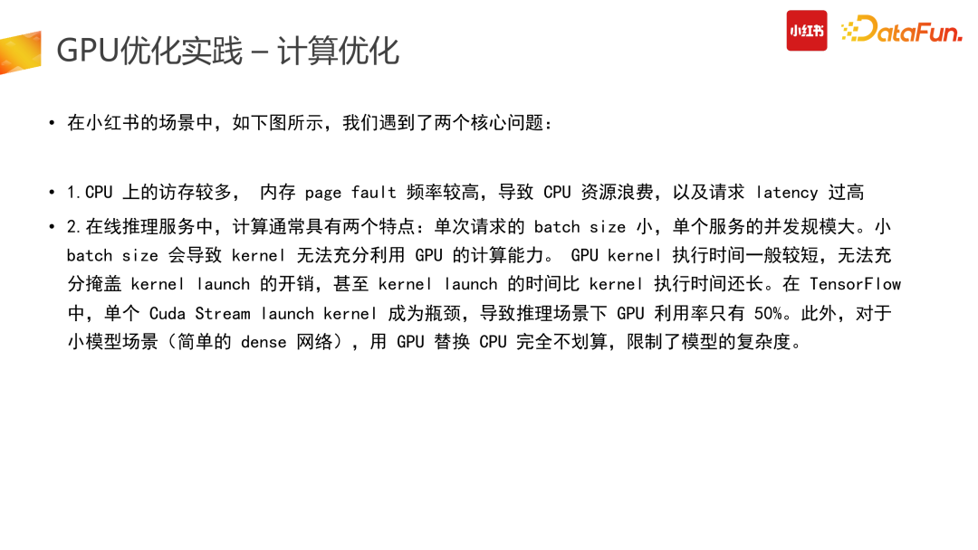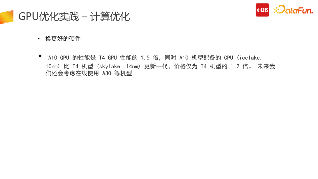 计算优化的一个较为明智的思路是找到冗余的计算量进行优化。推搜类的 CTR 模型存在了大量的冗余计算:推搜场景较为突出的特点是 1 个 user + N 个 item 的预估,而 Tensor 结构在原始计算 input 阶段需要展平,也就是 user 侧计算从数据侧会拆分成 N 份,而这部分计算是冗余的。第二个冗余是在使用原始 TensorFlow API 搭建整个 graph 时,一次请求数据会多次进GPU 计算处理,会有部分计算在 CPU 结束后传给 GPU,而这部分是不够高效的。因此我们在此进行了算子合并、优化推导,利用 CUDA 的 API 统一实现,让一次请求只进一次 GPU,减少多次进 GPU 的冗余计算功能。此外,还可以计算前置,减少冗余计算。比如在产出模型时,需要对变量算子进行冻结,把变量算子转换成常量算子,具体举例来说,在图冻结过程中,有+1+2 计算,可以静态地直接转换成 +3。图冻结化在产出中让整个计算使用率下降了 12%,非常有效。合并计算部分我们需要尽量做到用 GPU 的 CUDA 实现,减少外部数据计算完再进 GPU 的拷贝问题,会带来较高的性能提升。(5)换更好的硬件