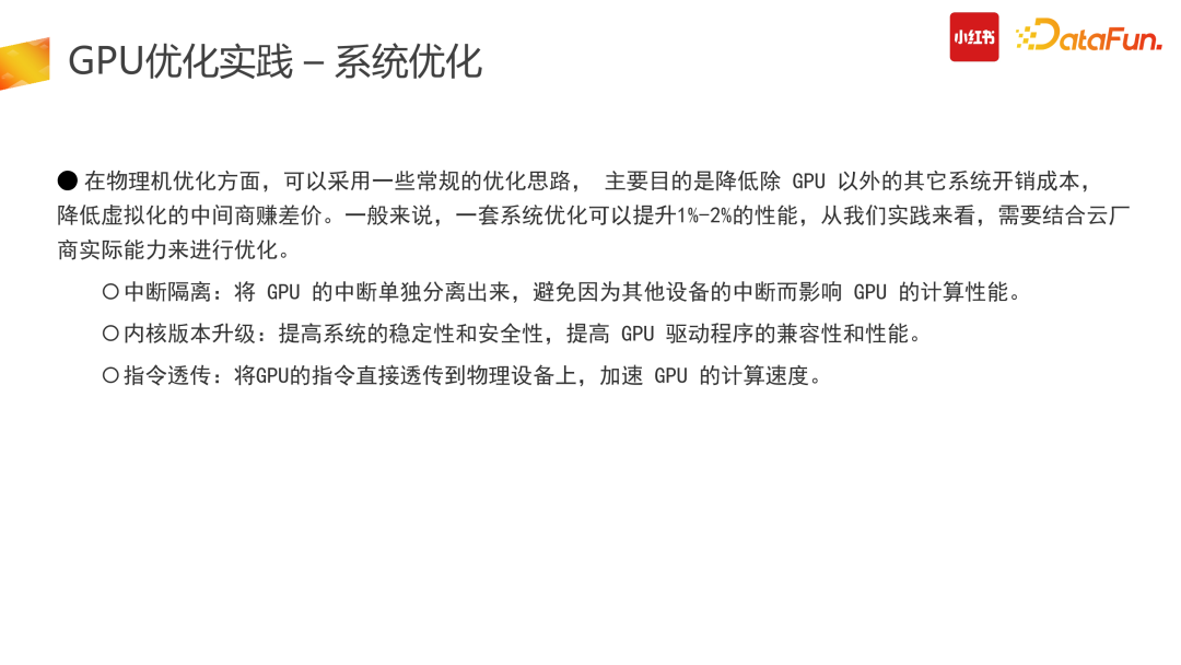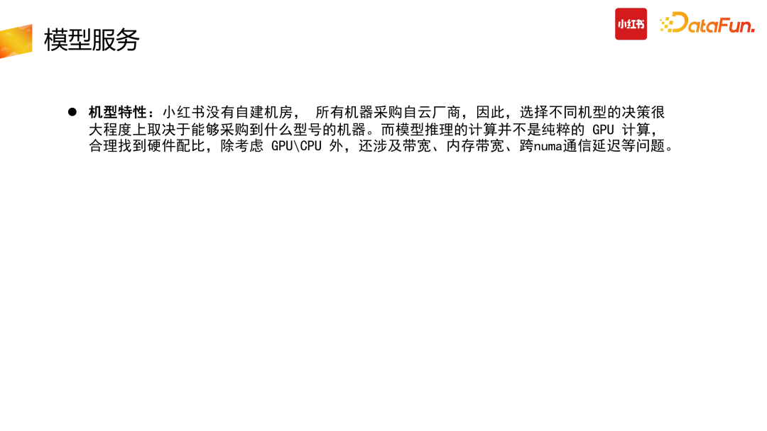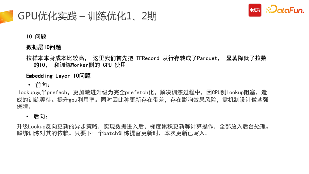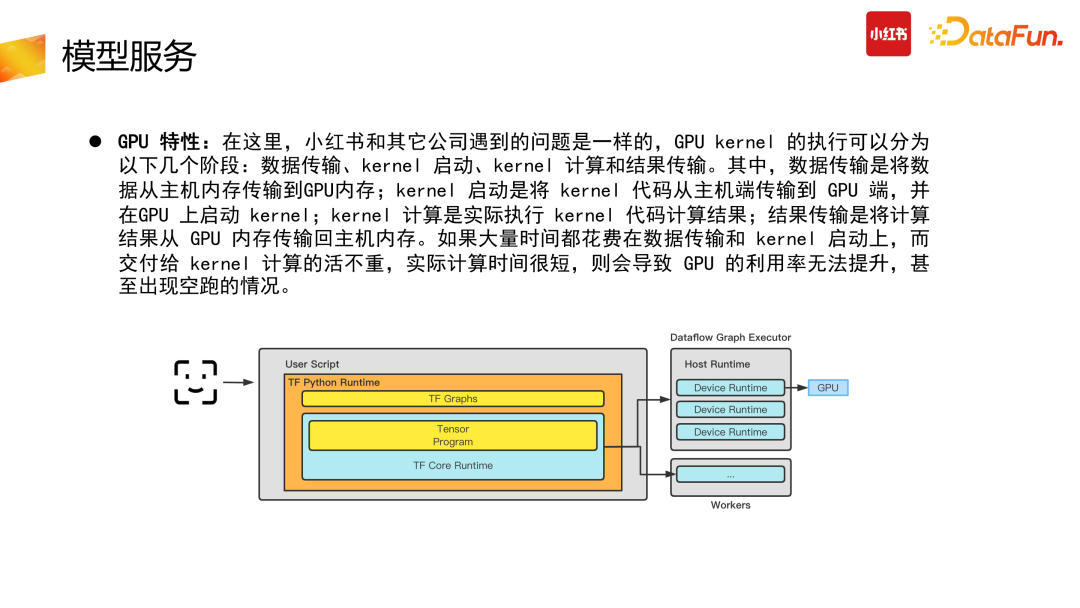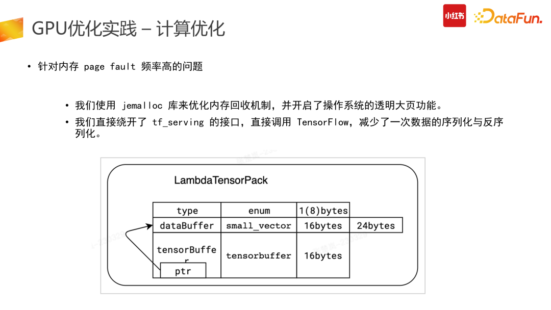 计算优化的一个较为明智的思路是找到冗余的计算量进行优化。推搜类的 CTR 模型存在了大量的冗余计算:推搜场景较为突出的特点是 1 个 user + N 个 item 的预估,而 Tensor 结构在原始计算 input 阶段需要展平,也就是 user 侧计算从数据侧会拆分成 N 份,而这部分计算是冗余的。第二个冗余是在使用原始 TensorFlow API 搭建整个 graph 时,一次请求数据会多次进GPU 计算处理,会有部分计算在 CPU 结束后传给 GPU,而这部分是不够高效的。因此我们在此进行了算子合并、优化推导,利用 CUDA 的 API 统一实现,让一次请求只进一次 GPU,减少多次进 GPU 的冗余计算功能。此外,还可以计算前置,减少冗余计算。比如在产出模型时,需要对变量算子进行冻结,把变量算子转换成常量算子,具体举例来说,在图冻结过程中,有+1+2 计算,可以静态地直接转换成 +3。图冻结化在产出中让整个计算使用率下降了 12%,非常有效。合并计算部分我们需要尽量做到用 GPU 的 CUDA 实现,减少外部数据计算完再进 GPU 的拷贝问题,会带来较高的性能提升。(5)换更好的硬件