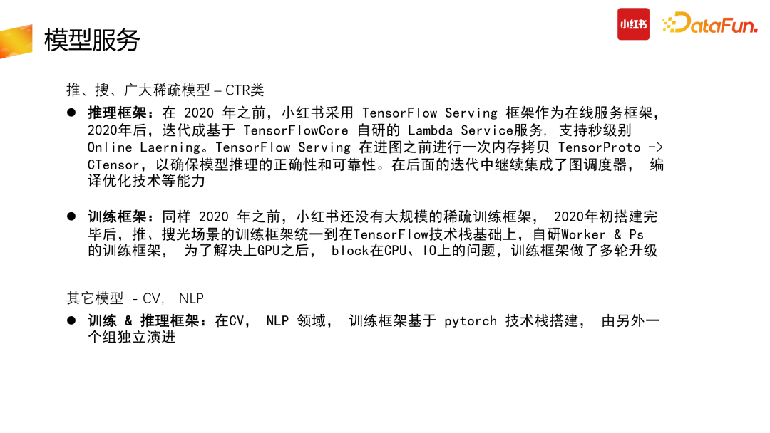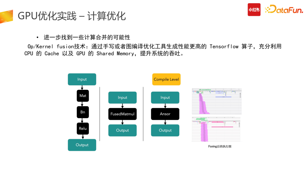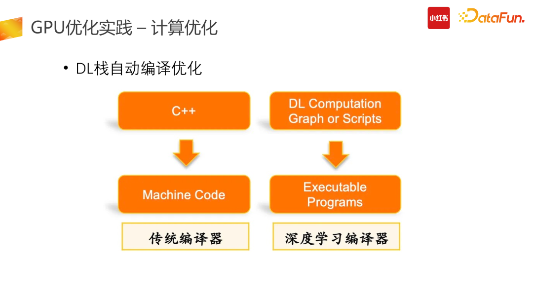 计算优化中一个非常直接的优化就是换更好的硬件。在线推理阶段没必要用到 A100 这种特别贵的卡,可以用 A10 替换 T4,提升了 1.5 倍的性能,但只花了 1.2 倍的钱。未来我们还会考虑在线使用 A30 等机型进行推理。同时,随着硬件厂商的版本迭代,我们也会直接去换更好的硬件,取得线上的成本收益。但换了硬件后,前置放在 CPU 上的计算部分会更加鸡肋,总会存在一些 Vlookup 特征,合并交叉哈希计算等不适合在 GPU 上处理。这时候则需要推进到第三步,也就是我们会浪费一些时延,把前面 CPU 计算部分拆分出去。Inference 架构会变为请求先经过 CPU 计算,后进行 GPU 在线推理。后面随着硬件 GPU 不断升级,CPU 实在跟不上的情况下,则会继续拆分。(6)DL 栈自动编译优化