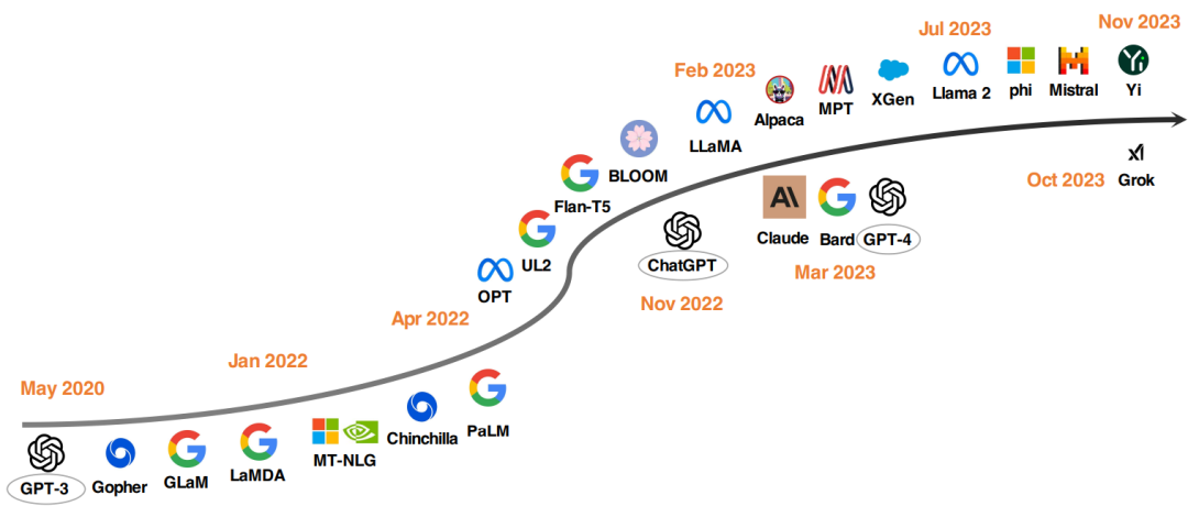 去年,OpenAI 发布的 ChatGPT 推动了 NLP 领域的研究,随后 Google 和 Anthropic 又相继推出了 Bard 和 Claude。尽管它们在很多任务上表现突出,但与 GPT-4 相比仍存在着性能上的差距。为促进开源 LLM 的发展,Meta 发布了 Llama 系列模型,以及 Alpaca、Vicuna、Lima 和 WizardLM 等模型,它们通过微调实现了不断的发展,同时还有其他工作致力于从头开始训练强大的 LLM。未来,开发更强大、高效的开源 LLM 是具有前途的研究方向。