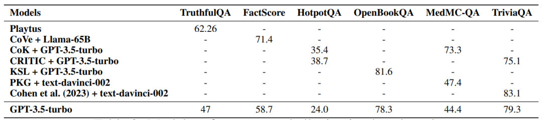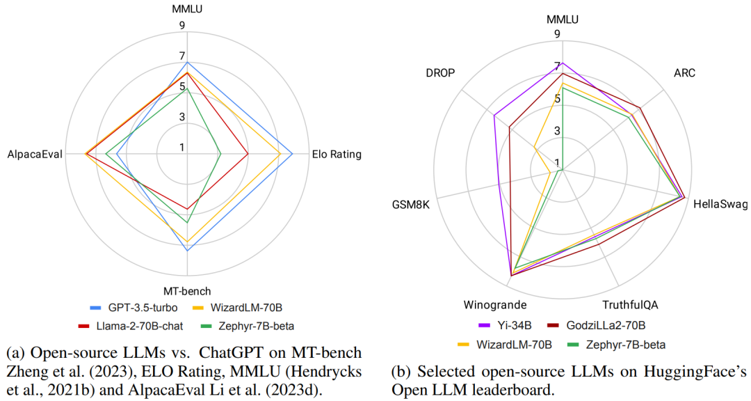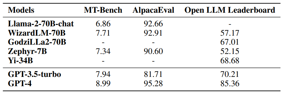 如表 1 所示,在通用任务中,Llama-2-chat-70B 相较于 GPT3.5-turbo 在一些基准上表现更好,但在其他测试中仍稍显不足。Zephir-7B 通过优化偏好逼近 70B 的 LLM。WizardLM-70B 和 GodziLLa-70B 则能够与 GPT-3.5-turbo 相媲美。整体而言,GPT-4在几个评估指标上表现都是最好的,这是目前的很多开源模型所不能比的,也是其未来所要努力的方向。