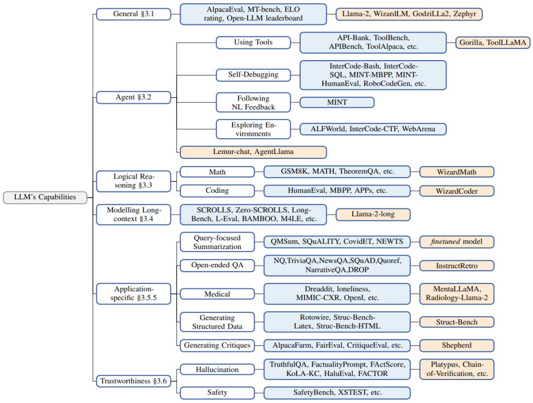 ▲图2 LLM 能力和表现最佳的开源 LLM 类型。白色方框表示领域,蓝色方框表示特定数据集,橙色方框表示开源LLM图 2 展示了在各种任务中超越或赶上 ChatGPT 的开源 LLM。