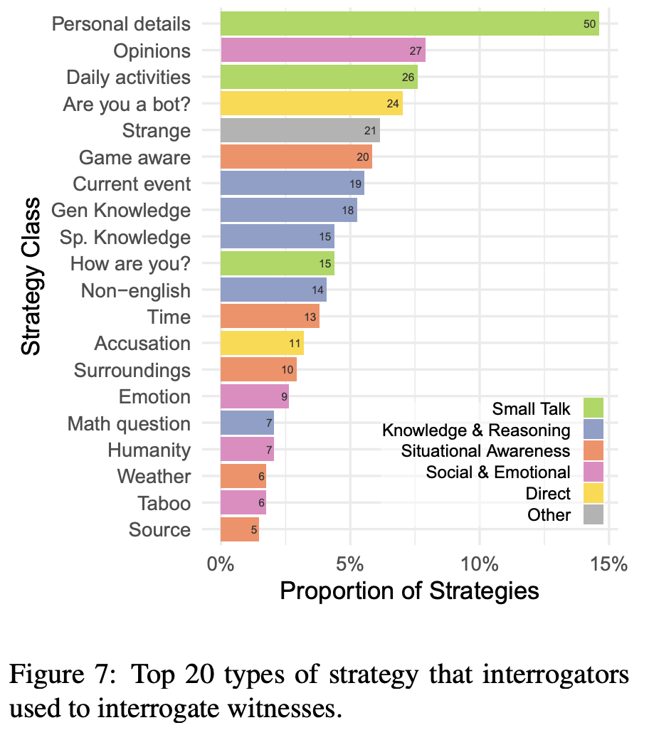 最常见的策略类型是闲聊(27%),询问见证者当天在做什么以及他们生活中的其他个人细节。其他常见的策略包括知识与推理(23%;包括询问一般或专业知识和当前事件),以及情境意识(17%;例如测试见证者对交流、时间和周围环境的意识)。