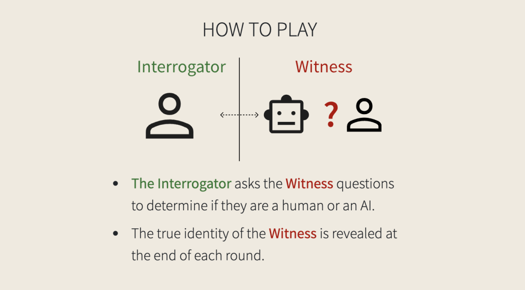 如果在45 + N(1, 7)秒的超时后没有找到人类匹配,玩家将与人工智能匹配。在人类对战中的两名参与者被随机分配为审问者和见证者角色。