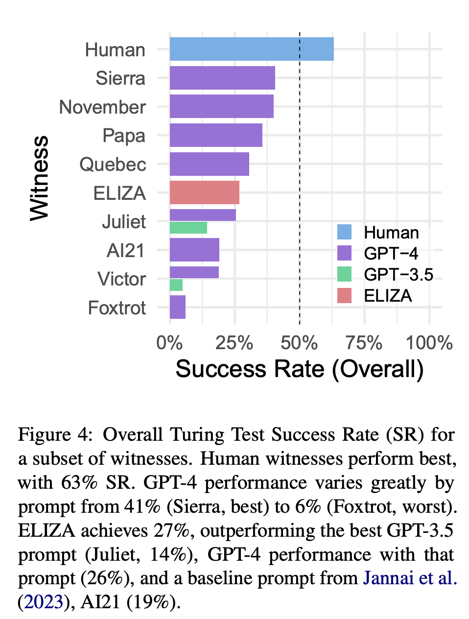 研究人员发现,ELIZA在27%的交流中成功地欺骗了人类审问者,表现优于几个GPT-4见证者和所有GPT-3.5见证者。