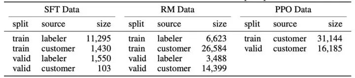 因为 InstructGPT/ChatGPT 是在 GPT-3 基础上做的微调。因为涉及了人工标注,它们数据总量并不大。下表展示了三份数据的来源及其数据量: