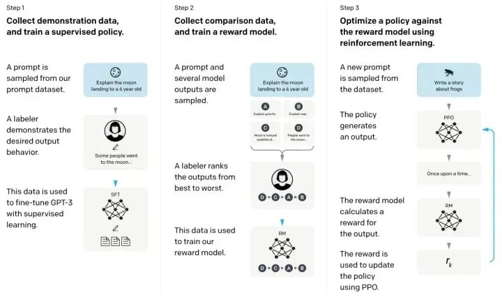 InstructGPT/ChatGPT 有三步训练方式。这三步训练会涉及三个模型:SFT,RM以及PPO。