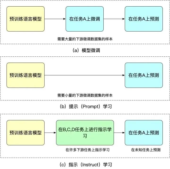 指示学习的优点是它经过多任务的微调后,也能够在其他任务上做 zero-shot,而提示学习都是针对一个任务的。泛化能力不如指示学习。我们可以通过下图来理解微调,提示学习和指示学习。