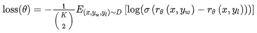 其中 rθ (x,y) 是提示 x 和响应 y 在参数为 θ 的奖励模型下的奖励值,yw 是标注工更喜欢的响应结果,yl 是标注工不喜欢的响应结果。D 是整个训练数据集。
