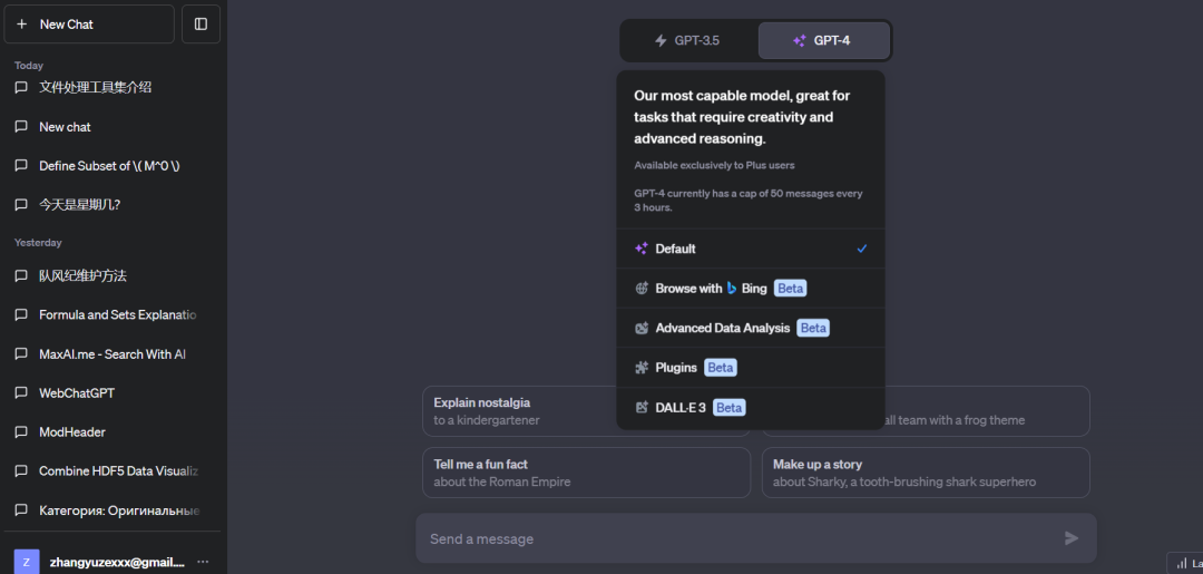 另外,告诉大家一个好消息。我们这个共享系统所有的官方Plus账号都被内测到了 ChatGPT Alpha 阿尔法账号 all tools功能,具备 GPT 集合所有功能融合成一体 (默认就是4.0模型,可联网,可绘画,可识图,可上传文件分析) 。