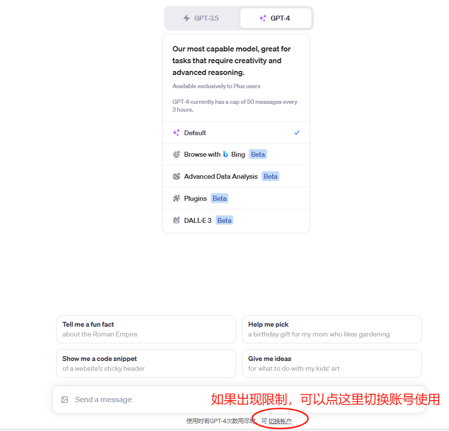 5、可以使用官方的Browsing联网功能,数据都是最新的,不局限在之前的2021年数据了。我这边举例:怎么看待李佳奇卖华西子翻车事件?可以看到GPT-4的回复很棒,简直是神器 !官方规定:GPT-4,每3小时40次的提问次数 ,这是很多人最头疼的 。不过,如果购买我们的系统账号,就不会出现这种问题,我们系统提供了100多个官方共享账号,如果限制了,可以立即切换其他的GPT4.0账号,立马又可以正常使用了 。如下图所示: