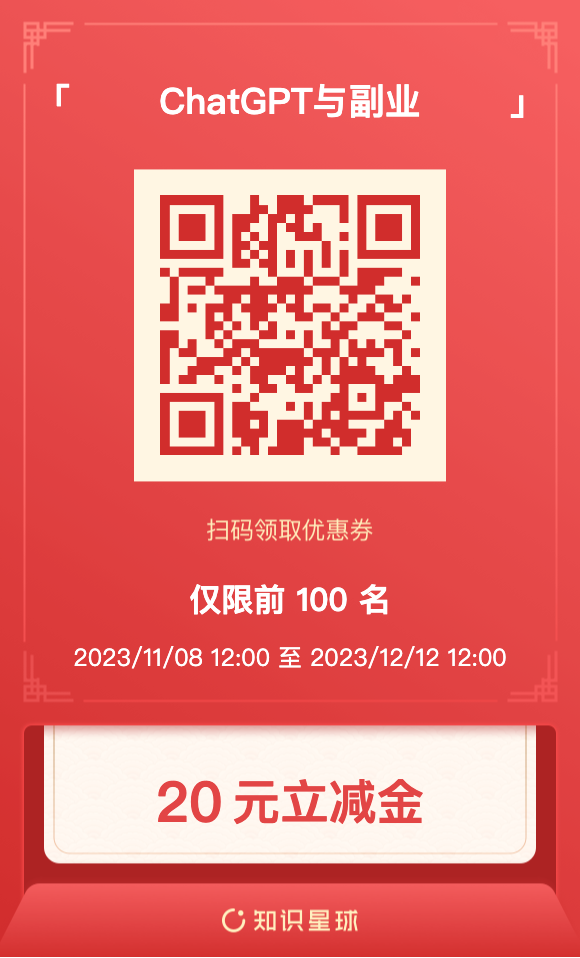 为了跟上AI时代我干了一件事儿,我创建了一个知识星球社群:ChartGPT与副业。想带着大家一起探索ChatGPT和新的AI时代。