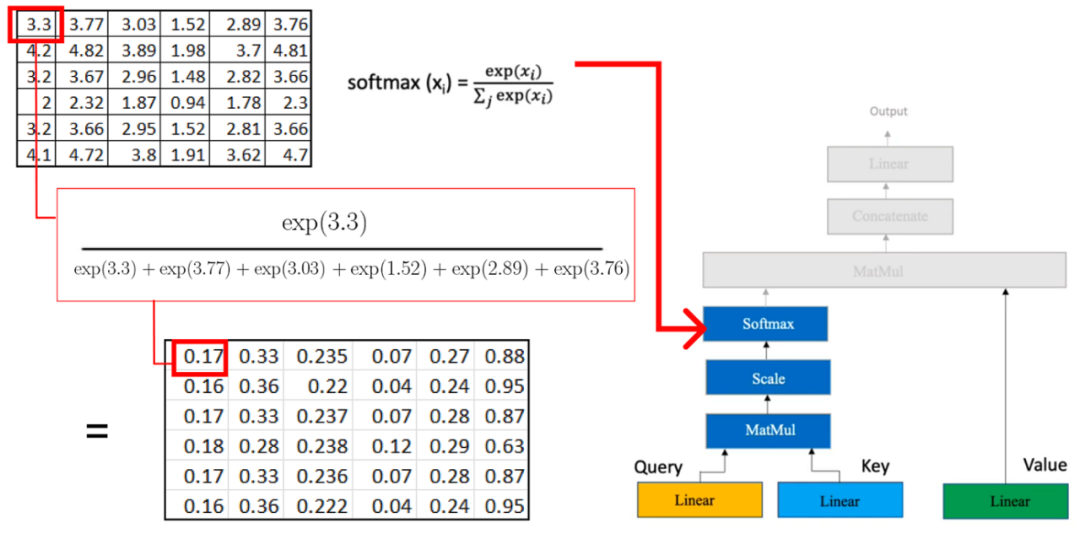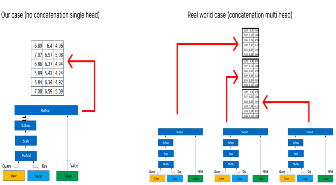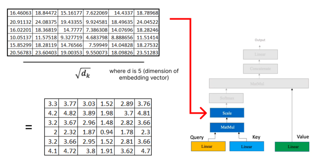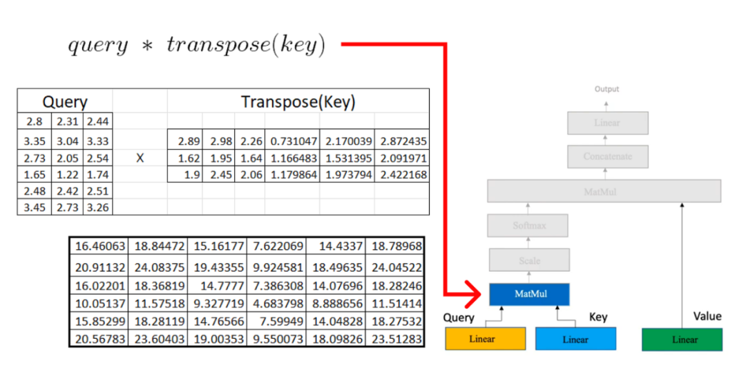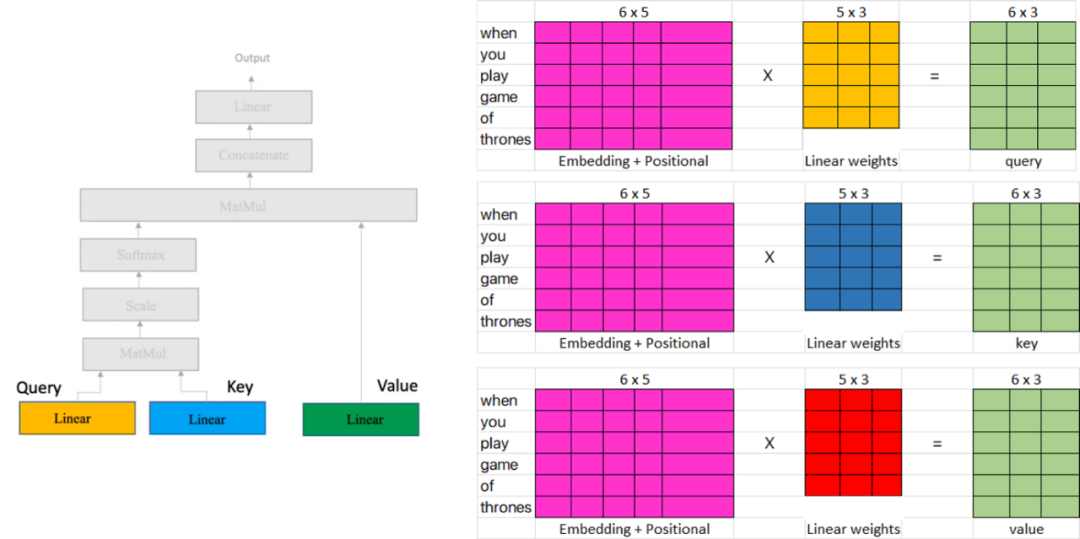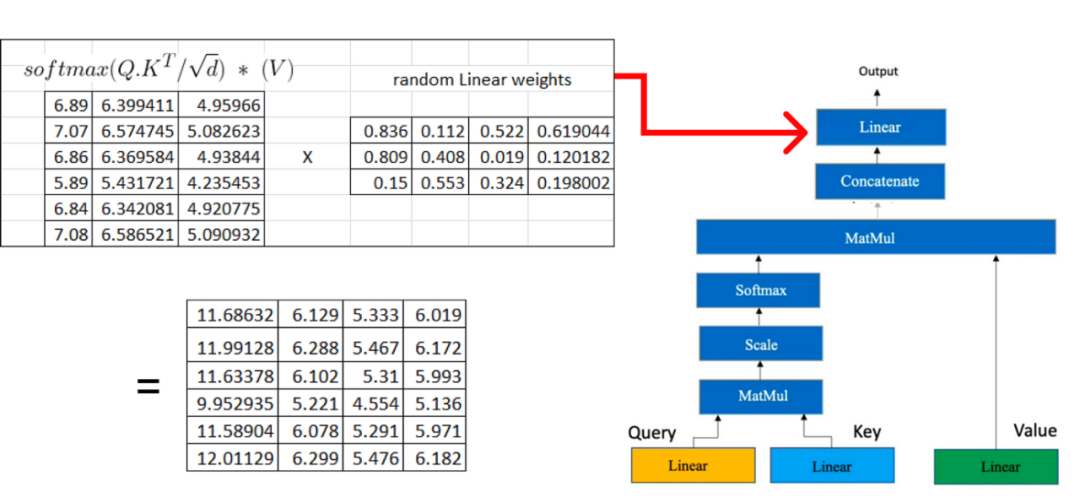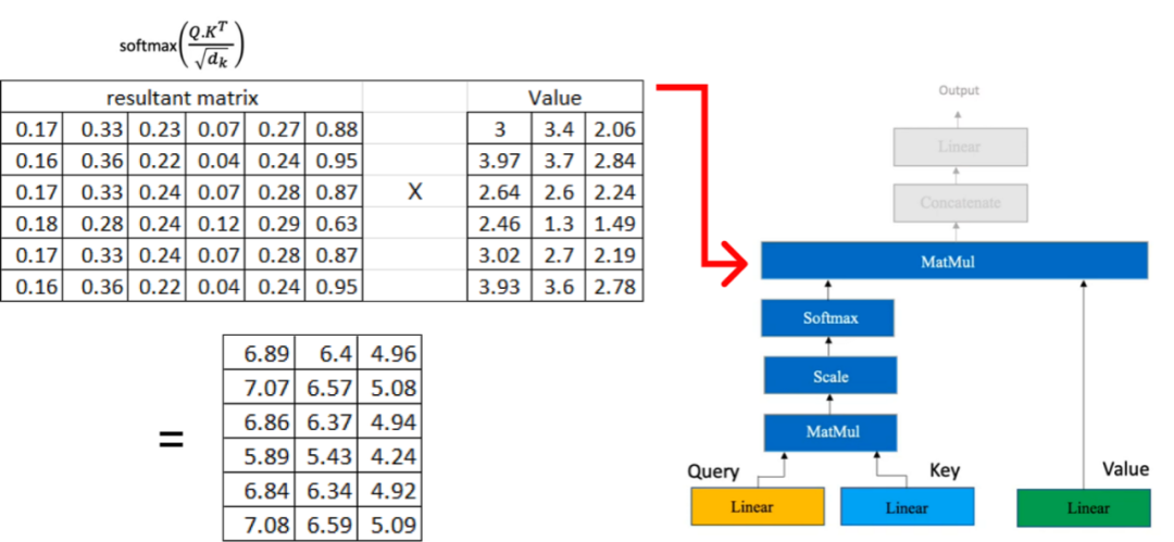 在上面提供的图中,三个输入矩阵 (粉红色矩阵) 表示从将位置embedding添加到单词embedding矩阵的上一步获得的转置输出。另一方面,线性权重矩阵 (黄色,蓝色和红色) 表示注意力机制中使用的权重。这些矩阵的列可以具有任意数量的维数,但是行数必须与用于乘法的输入矩阵中的列数相同。在我们的例子中,我们将假设线性矩阵 (黄色,蓝色和红色) 包含随机权重。这些权重通常是随机初始化的,然后在训练过程中通过反向传播和梯度下降等技术进行调整。所以让我们计算 (Query, Key and Value metrices):一旦我们在注意力机制中有了query, key, 和value矩阵,我们就继续进行额外的矩阵乘法。